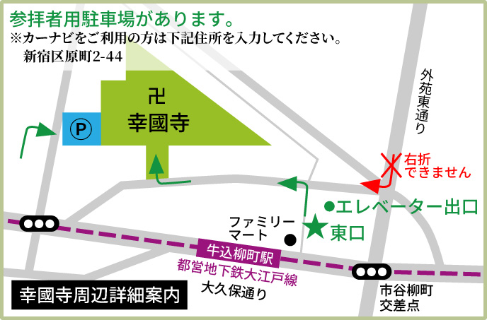 お墓が遠いとお墓参りに行くのが大変ですよね。幸國寺は都営大江戸線牛込柳町駅徒歩2分の駅チカでお参りがらくらくです。車椅子の方でも安心のバリアフリー設計の本堂、ホールもありますのでご安心ください。お車でお越しの方にも参拝者専用駐車場があります。
